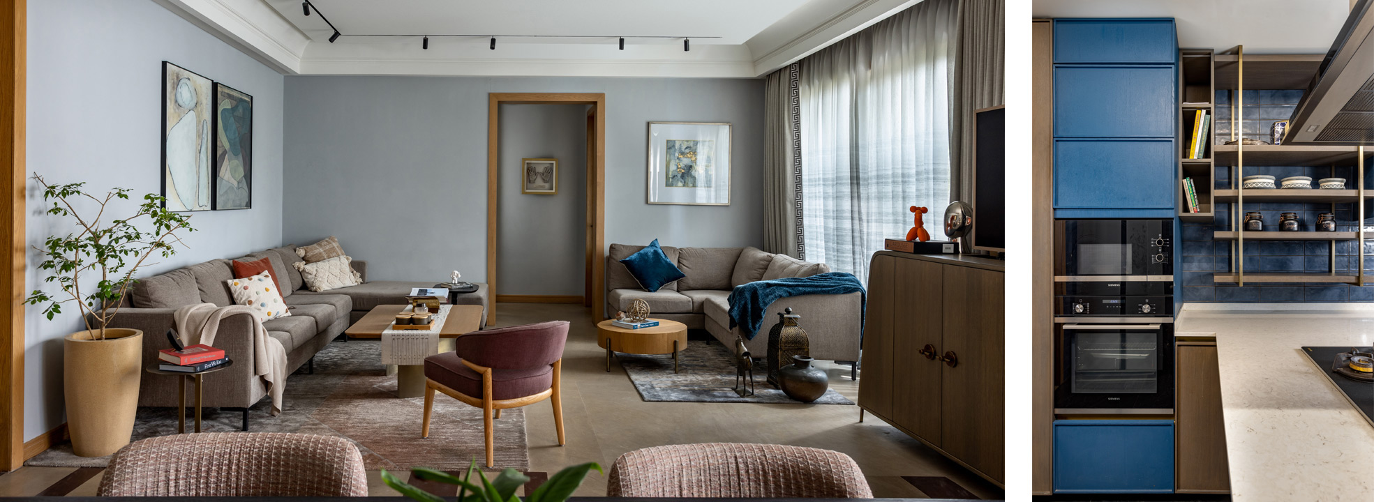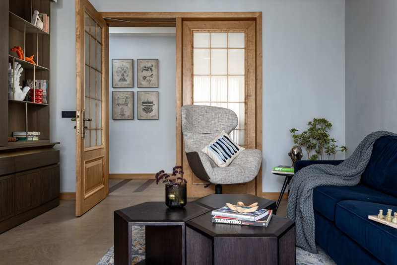 Aalay, one of our residential projects in New Delhi, embodies the concept of a ‘home for all ages’ with a multi-generational family living harmoniously under one roof. From the eldest grandmother to the youngest child, the design caters to the diverse needs of its occupants that span four generations. Spatially, it features a versatile multi-functional area that serves as an informal gathering space and study, anchored by an inviting blue couch that contrasts with warm, earthy tones, fostering comfort and intimacy. This space is enhanced by a concealed bar unit and storage, maximising its practicality. The open-plan layout seamlessly integrates the living room and dining area, enhancing spatial flexibility. Further, the space adorns neutral shades and hues of fabric, flooring, and furnishing that create a serene and timeless ambiance in the house.