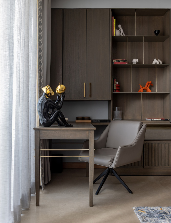 Another residential project, Barkat, imbues the idea of homes for all ages in its design differently. In terms of its layout, the adept introduction of selected furniture helps differentiate amidst various spaces while connecting them visually without using substantial physical partitions and bringing flexibility to the space. For instance, a central bar console sits at the median shared between the connected living and dining areas. In terms of the aesthetic language of the spaces, every object and piece of furniture is designed in tandem with the home’s exclusive needs, exploring a palette of hues and materiality that endow Barkat (prosperity) with a minimalist yet opulent essence. A pared-down palette of colours and luxe finish that balance each other and outlive market trends.