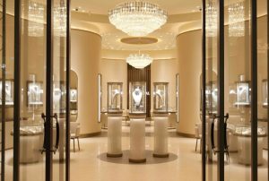 At Hazoorilal Legacy in Dubai, curved ceilings, sculpted niches, and floating vitrines guide movement with subtlety. A monochromatic palette of warm whites, marble, and bronze accents allows light to diffuse gently across surfaces, creating an environment that feels calm yet refined. The absence of overt ornamentation allows the architecture to recede, placing emphasis on spatial and emotional experience.