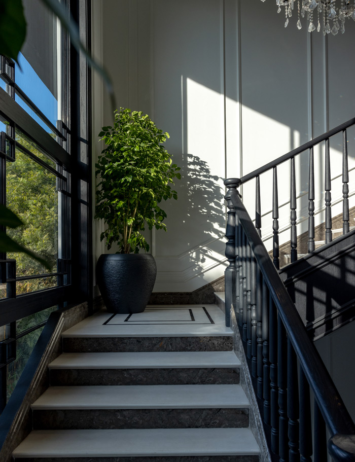 In House of Verandahs, classical inspiration meets contemporary craftsmanship through the use of marble, wood, and wrought iron detailing. The resulting staircase strikes a balance between tradition and modern simplicity, offering tactile richness without ornamentation.