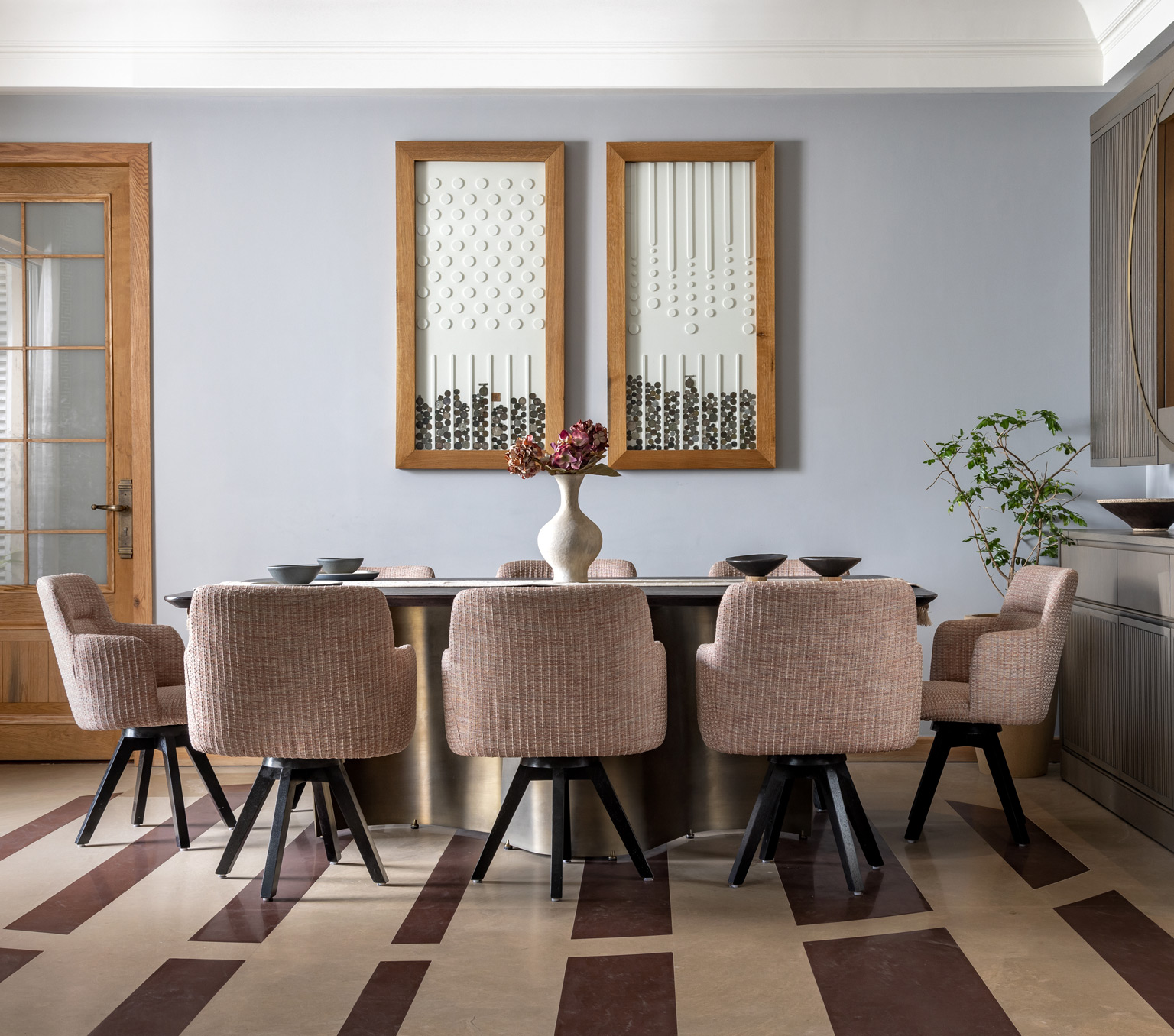 The design thoughtfully separates the apartment’s public and private spaces, with a generous passage defined by flooring patterns guiding visitors to the open living and dining areas—the heart of the home. Additionally, to the right of the passage lies a versatile, multifunctional room. The lobby, with its muted colour palette and coffered ceiling, creates a spacious and welcoming atmosphere for visitors.
