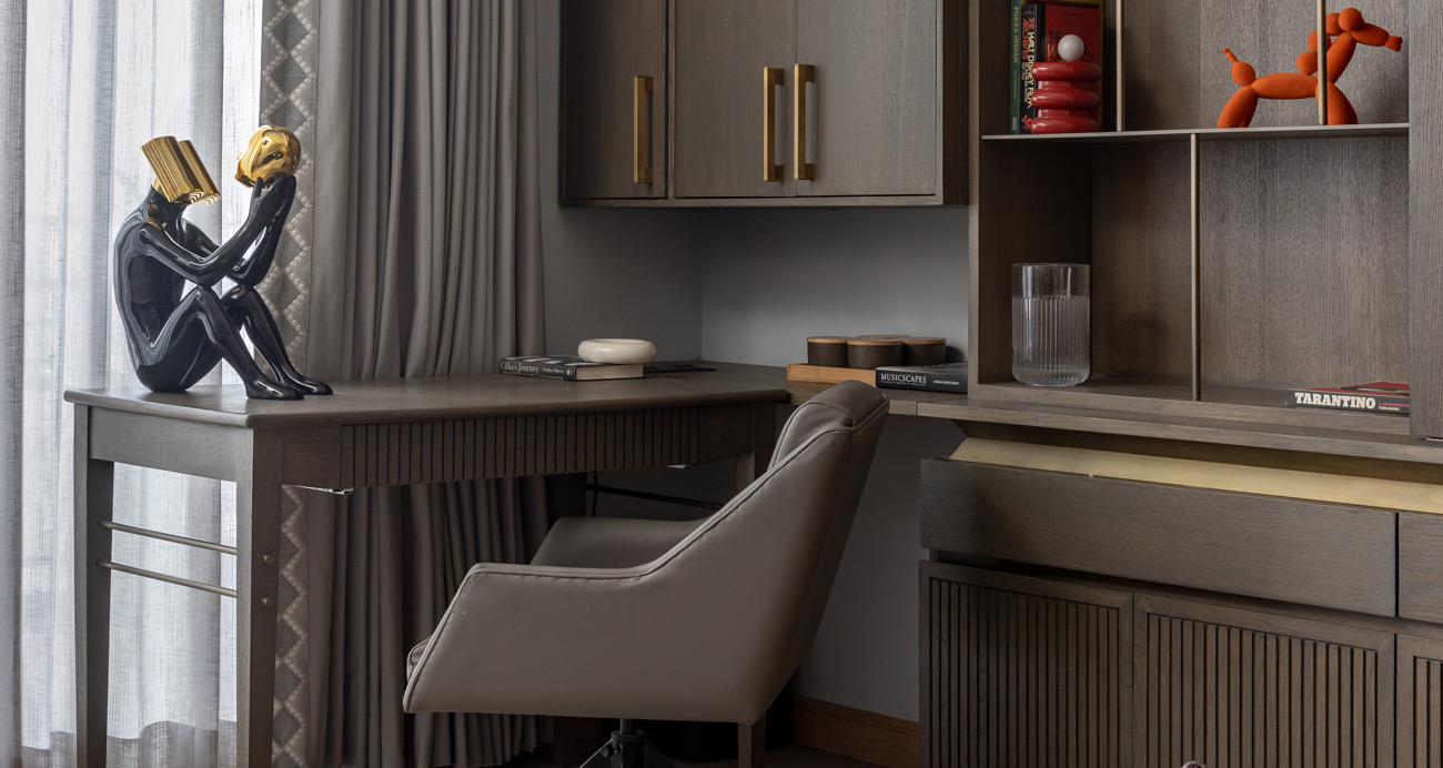 The design thoughtfully separates the apartment’s public and private spaces, with a generous passage defined by flooring patterns guiding visitors to the open living and dining areas—the heart of the home. Additionally, to the right of the passage lies a versatile, multifunctional room. The lobby, with its muted colour palette and coffered ceiling, creates a spacious and welcoming atmosphere for visitors.