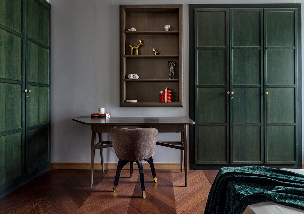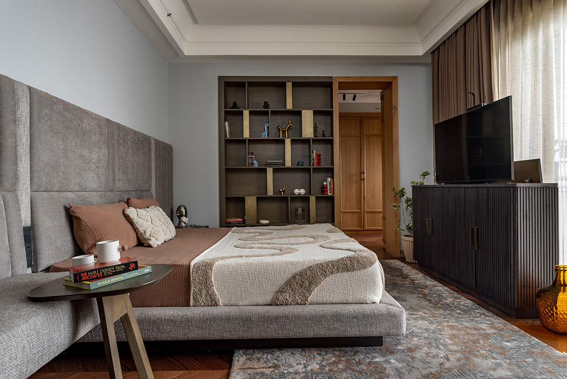 The bedroom designs align with the needs of each occupant. For instance, the master bedroom has a dressing area attached for convenience. This sophisticated design features a palette of light greys and browns, embracing minimalism to create a clutter free environment perfect for relaxation and reflection. A dedicated display area showcases personal items, adding warmth and individuality.