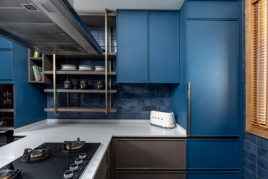 The multifunctional zone serves as both a resting area and a study cum informal gathering space for the home’s inhabitants. Furnished with an inviting blue couch and a bar unit enclosed in wooden cabinets, it provides an elegant setting for intimate gatherings and conversations. The interiors evoke a sense of comfort and contentment through a contrasting palette of warm, earthy tones and deep, dark hues.