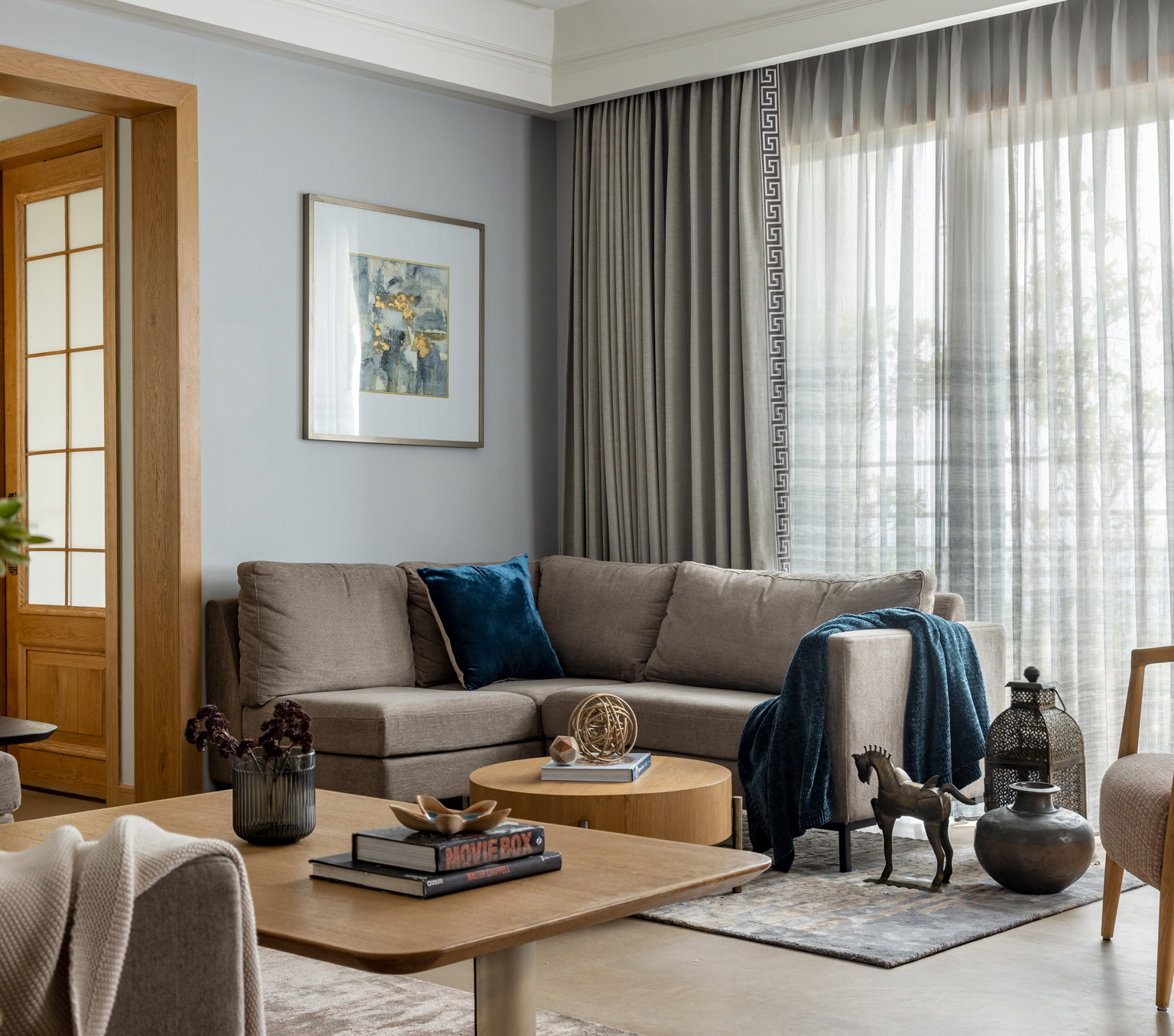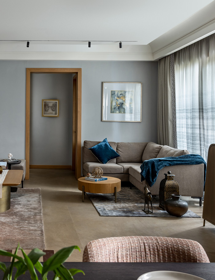 The living area, with its pale blue walls, beige marble flooring, and refined neutral furniture, is a receptacle of calm and quiet. The bespoke coffee table and the retractable TV unit with the soft profiles add a touch of sophistication to the living area.