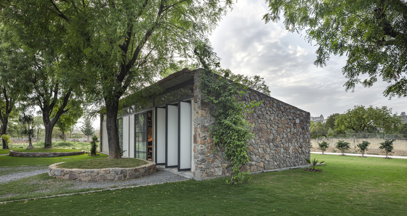 Oriented along the east-west axis, the blocks use dressed rubble masonry to shield interiors from intense sunlight. North-facing walls feature large glazed windows opening onto shaded verandahs, while southern walls have small fenestrations to control heat and glare. These strategies keep the studio cool in summer and bathed in soft winter light, creating an environment of diffused natural light ideal for clear thinking and inspiring views.