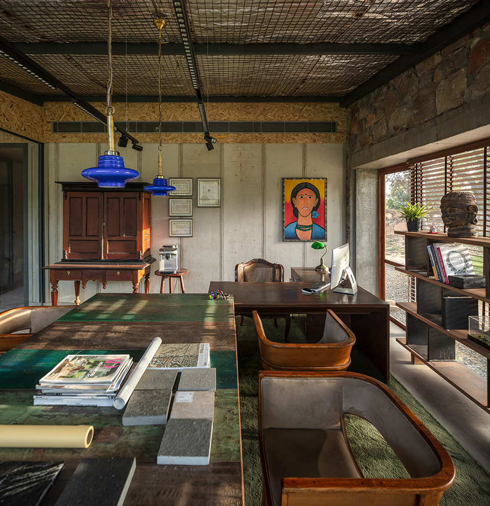 At the principal cabin’s entrance, intricately carved wooden columns from a demolished Mangalore home evoke the warmth of a traditional verandah. These repurposed columns reflect a design ethos rooted in heritage and sustainability, creating a welcoming threshold that blends cultural resonance with modern workspace charm.