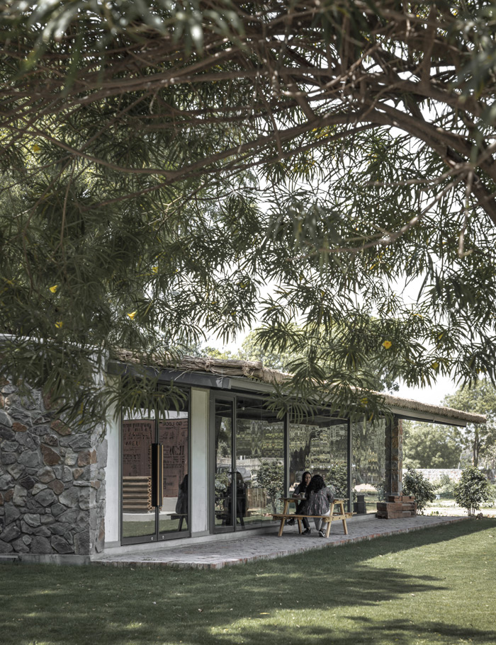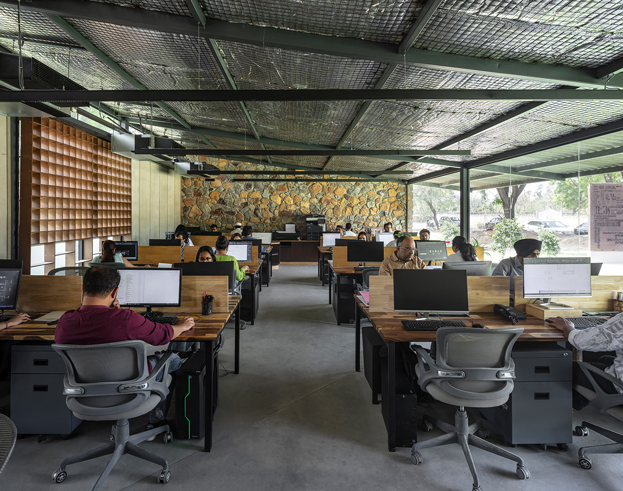 Tucked away at the quiet rear of the site, the workstation block opens into the outdoors on one side, with an overhang that shades the glazed façade, creating a comfortable buffer perfect for brainstorming, quiet reflection, or enjoying a coffee during the rains. Small shading devices on the opposite façade filter fresh air while softening harsh sunlight. This design approach nurtures creativity through a sensory blend of sight, sound, touch, and scent.