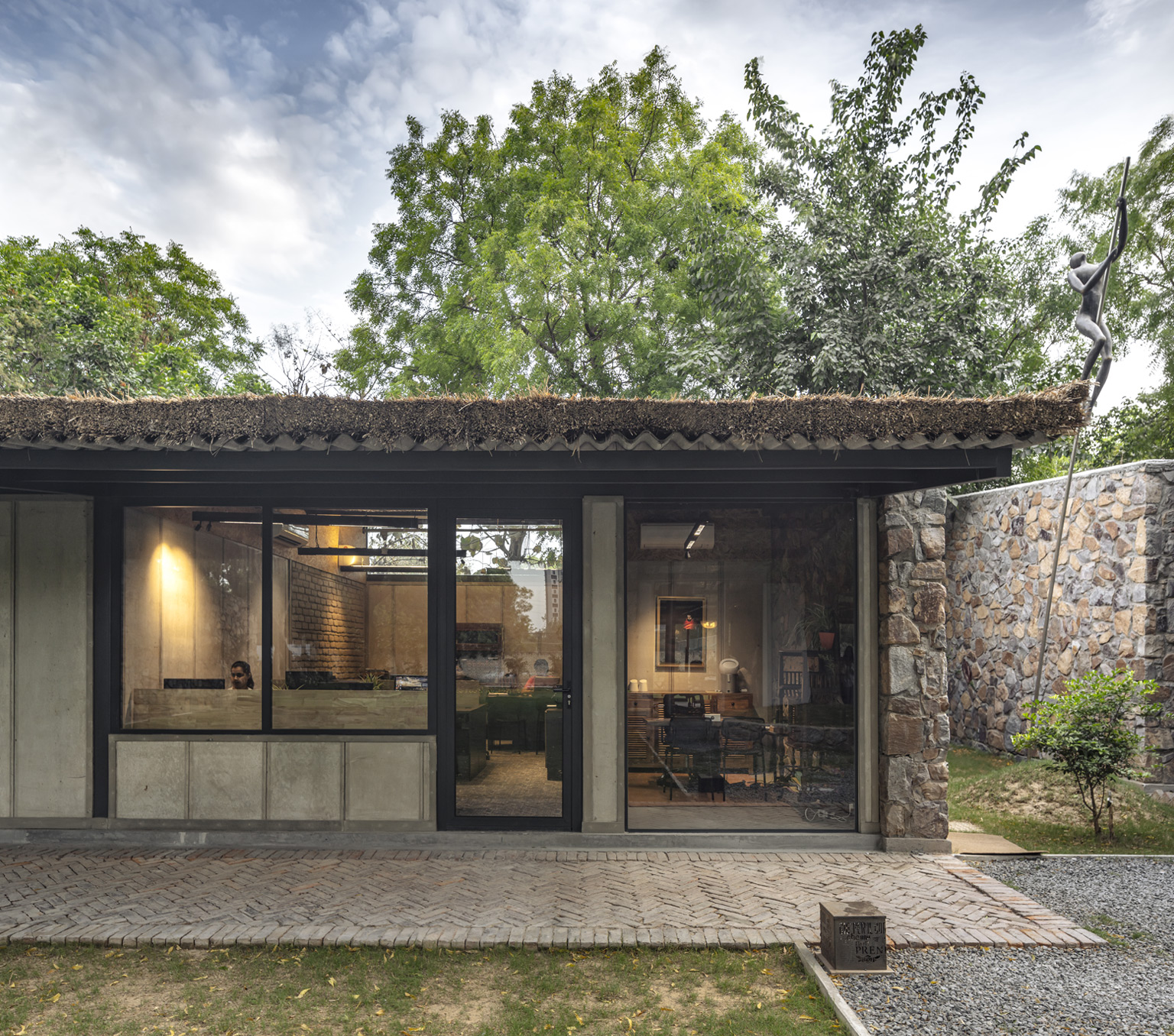 The layout comprises four distinct rectangular blocks, each dedicated to functions such as reception, meeting rooms, workstations, offices, and a cafeteria, all seamlessly integrated with lush lawns beneath the shade of dense tree canopies. Thoughtfully designed to encourage collaboration and creativity, the space draws inspiration from nature while respecting principles of climatology and Vastu. It’s modest scale and intimate proportions lend a welcoming, studio-like warmth, inviting visitors into a cosy, approachable environment.