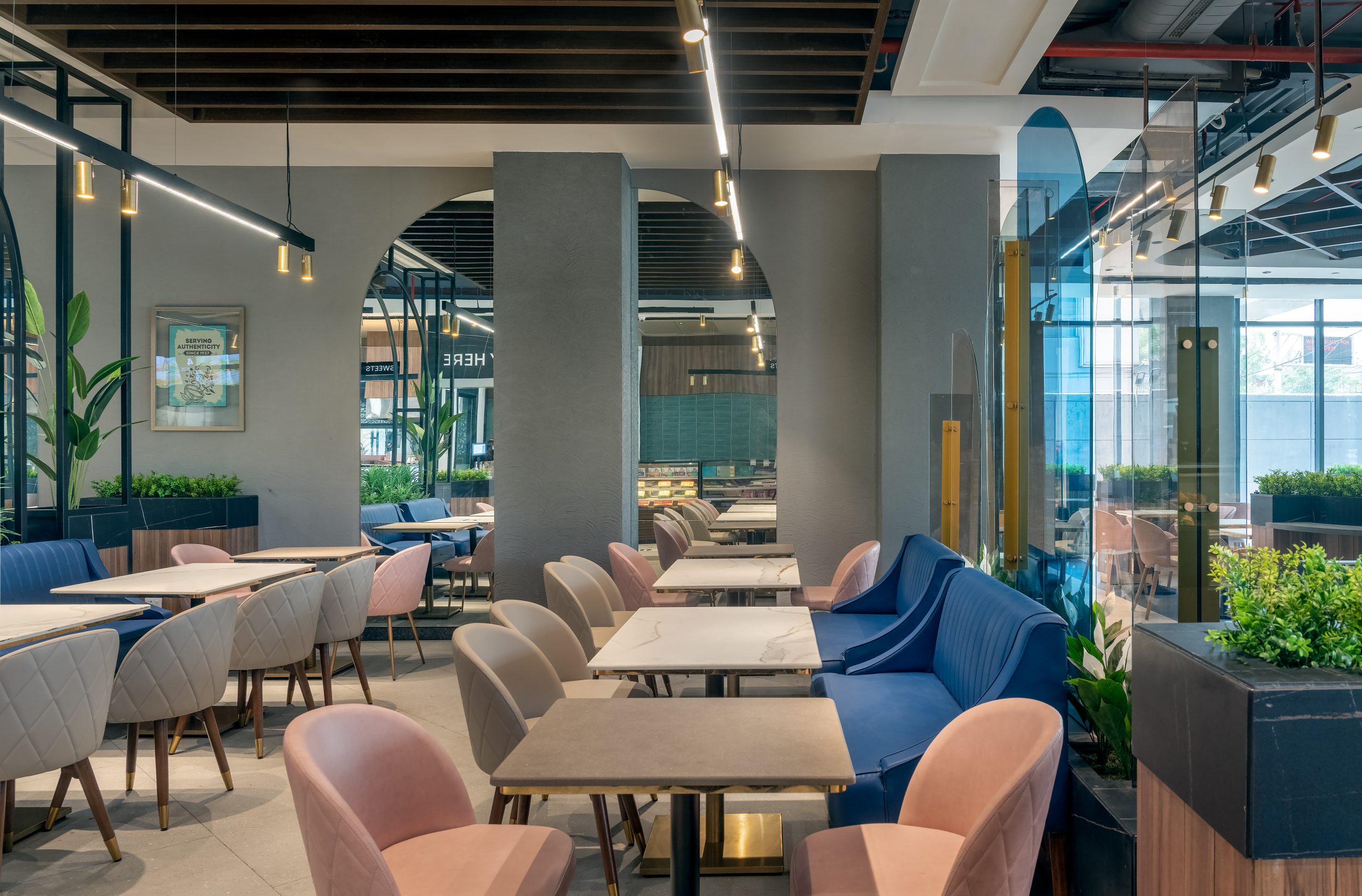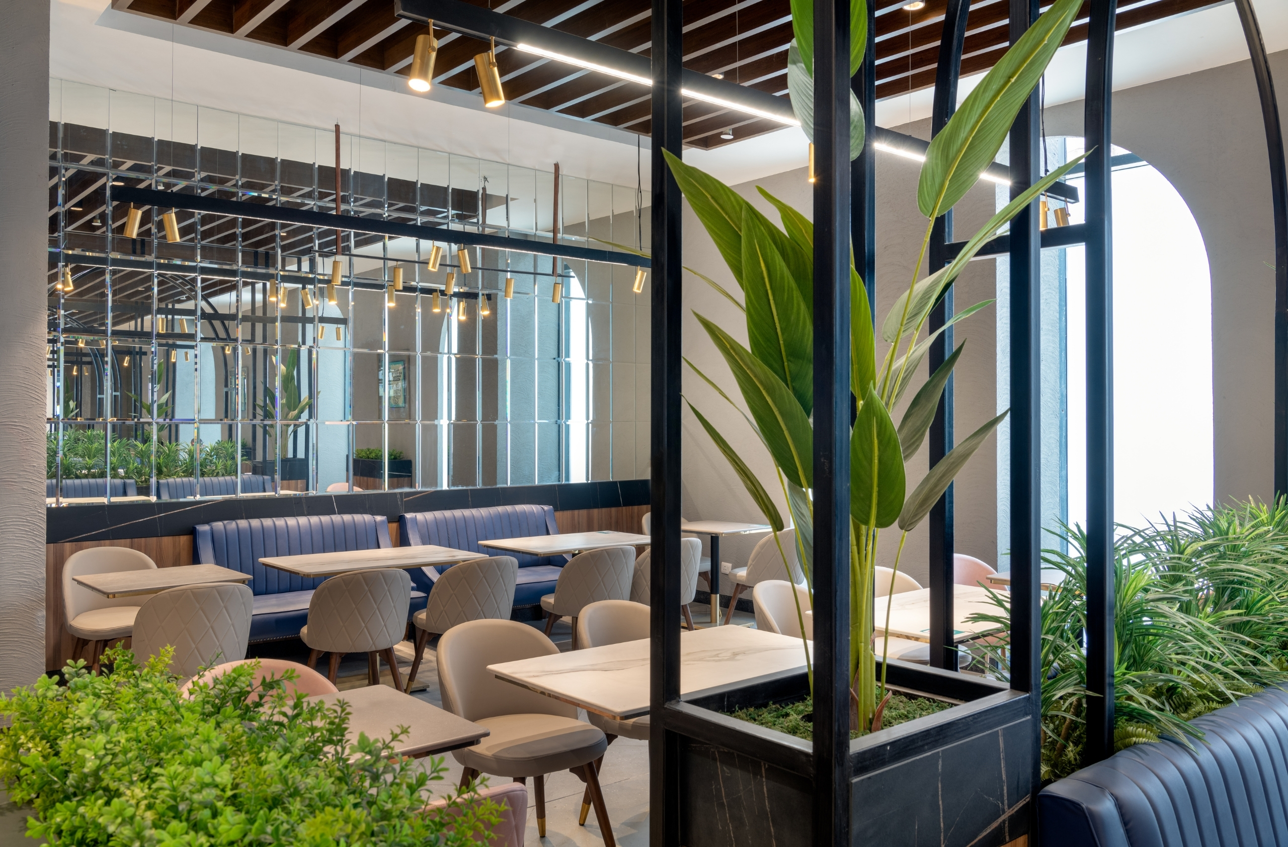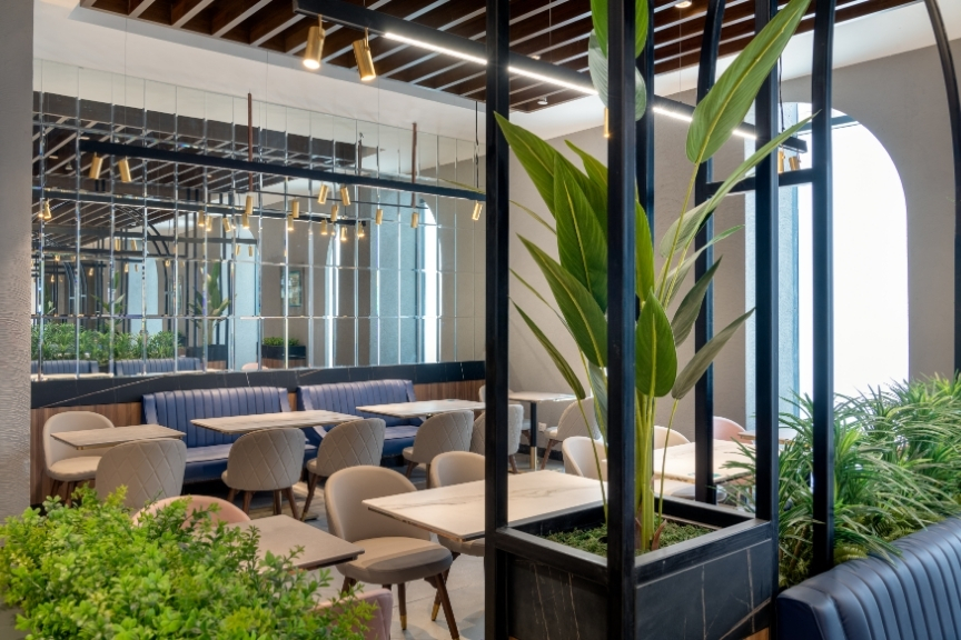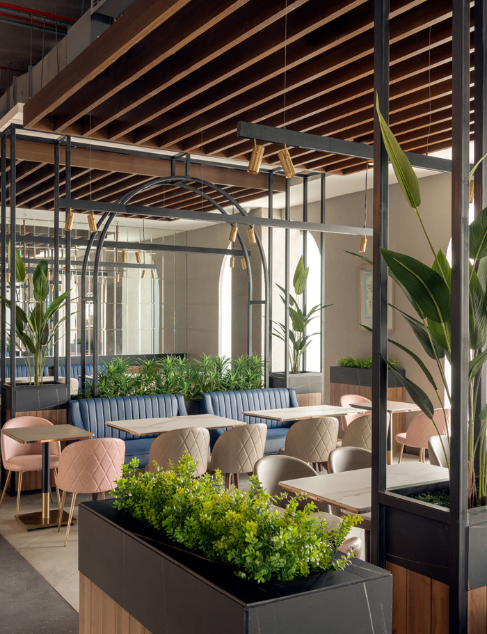 With a soothing palette of beige, deep blue, and blush pink, the studio has also conceptualised the interiors to bear an immersive and biophilic character. The various patrons at the venue layer the premises with activity and colour, bringing the otherwise minimalistic space to life! The introduction of a unified tone of wood in a walnut-cherry finish, solid-hued lustrous tiles, doses of indoor greenery, and the tactful usage of decorative mirrors and glass create a cohesive palette of spatial design.