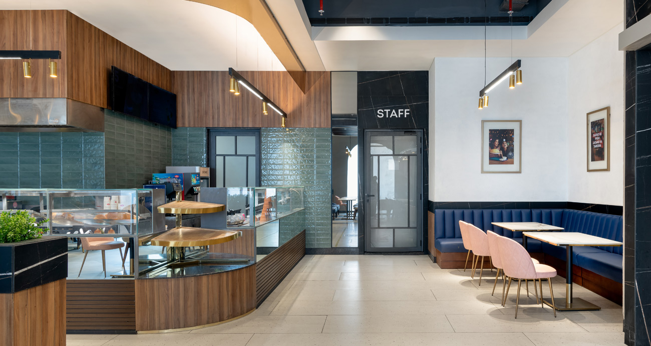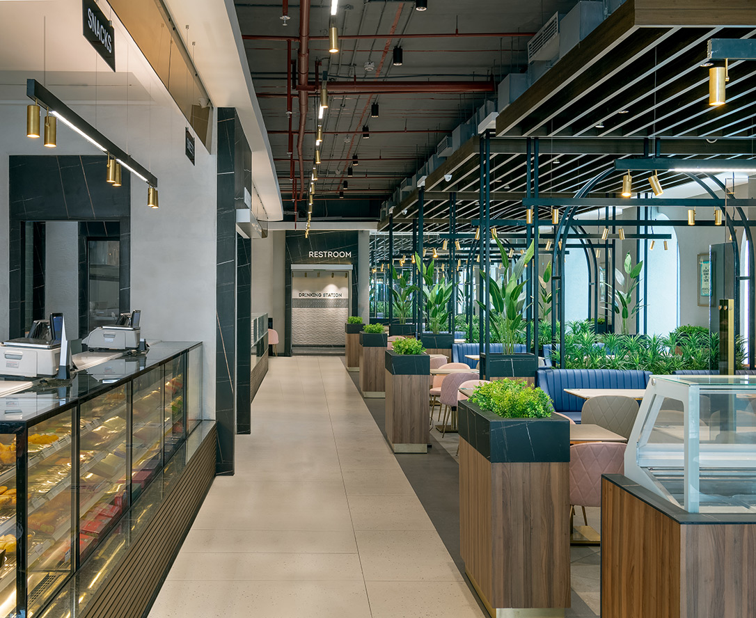 The site at hand was a former Mercedes showroom and inherently blessed the bare shell with a capacious floorplate and appreciable internal heights. The layout has been envisioned as three core zones that have been pragmatically designed while balancing function and aesthetics. Over 50% of the floorplan hosts the kitchen, service areas, and display counters with the brand’s products.