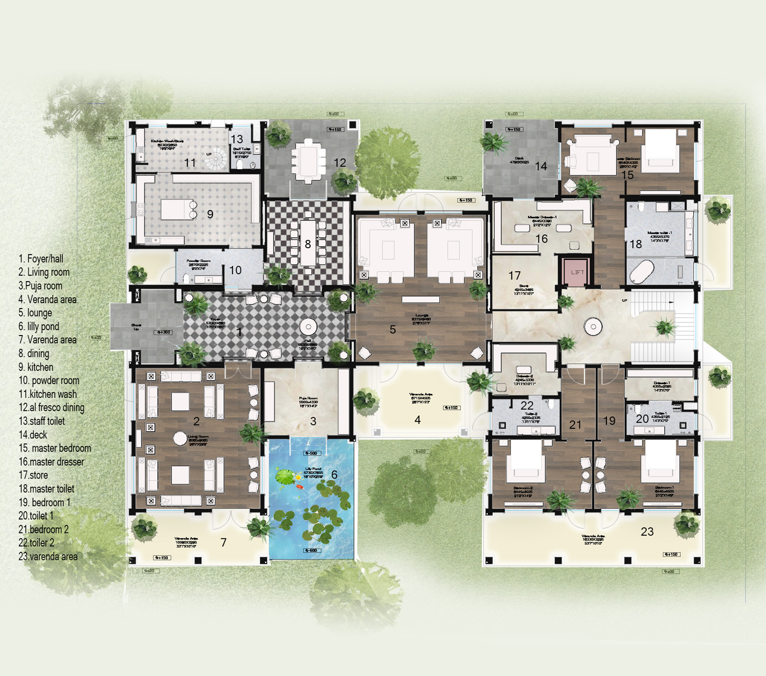 The design positions the residential block in the southwest site corner to maximize shade from existing large trees, reducing heat buildup and allowing north and east-facing rooms to benefit from abundant natural light and picturesque views of a landscaped garden. The layout is thoughtfully divided, with public areas like the living room, dining area, and utility rooms on the eastern side and private spaces, including the bedrooms, on the western side to ensure privacy. This approach combines open, semi-open, and enclosed spaces to create serene vistas and maintain a comfortable indoor climate year-round.