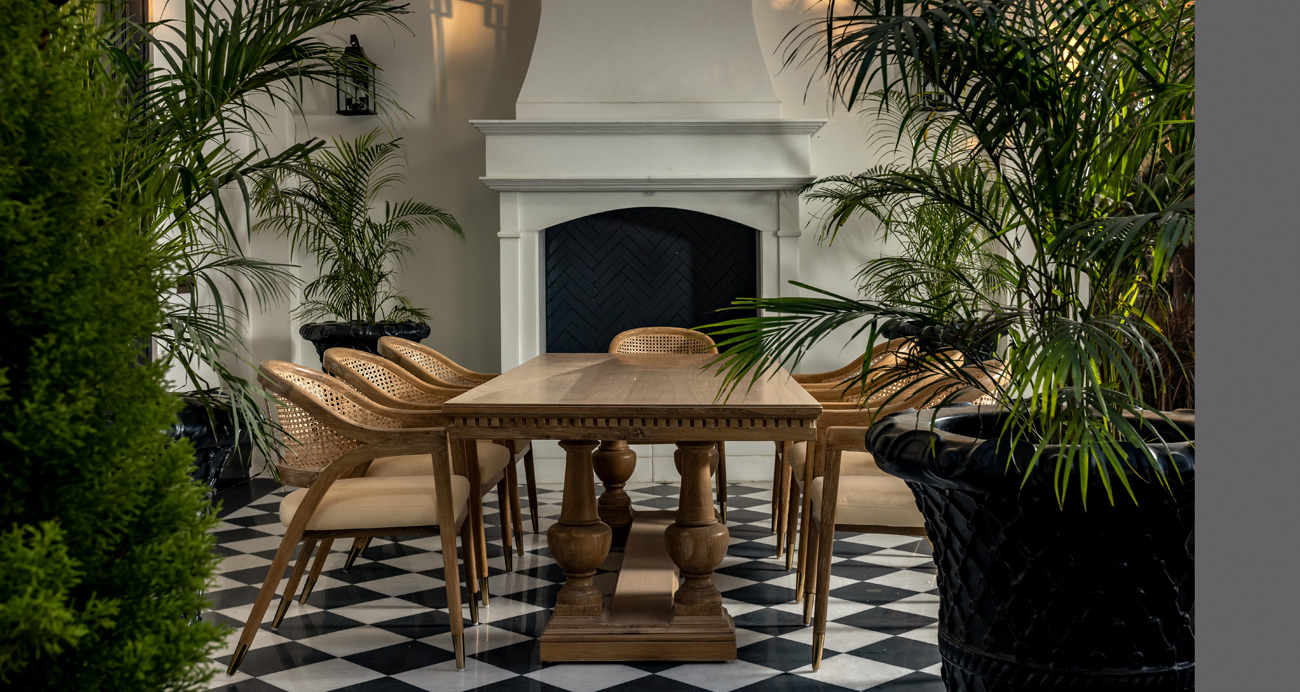 Vaulted east-facing entrance of the residence reinforces the flow and direction of the space, allowing natural light to pour through its double-height volume and illuminate the central living area. This passage showcases intricate flooring patterns, exemplifying exquisite craftsman. The ship that not only greets visitors with elegance but also adds a touch of grandeur upon arrival.