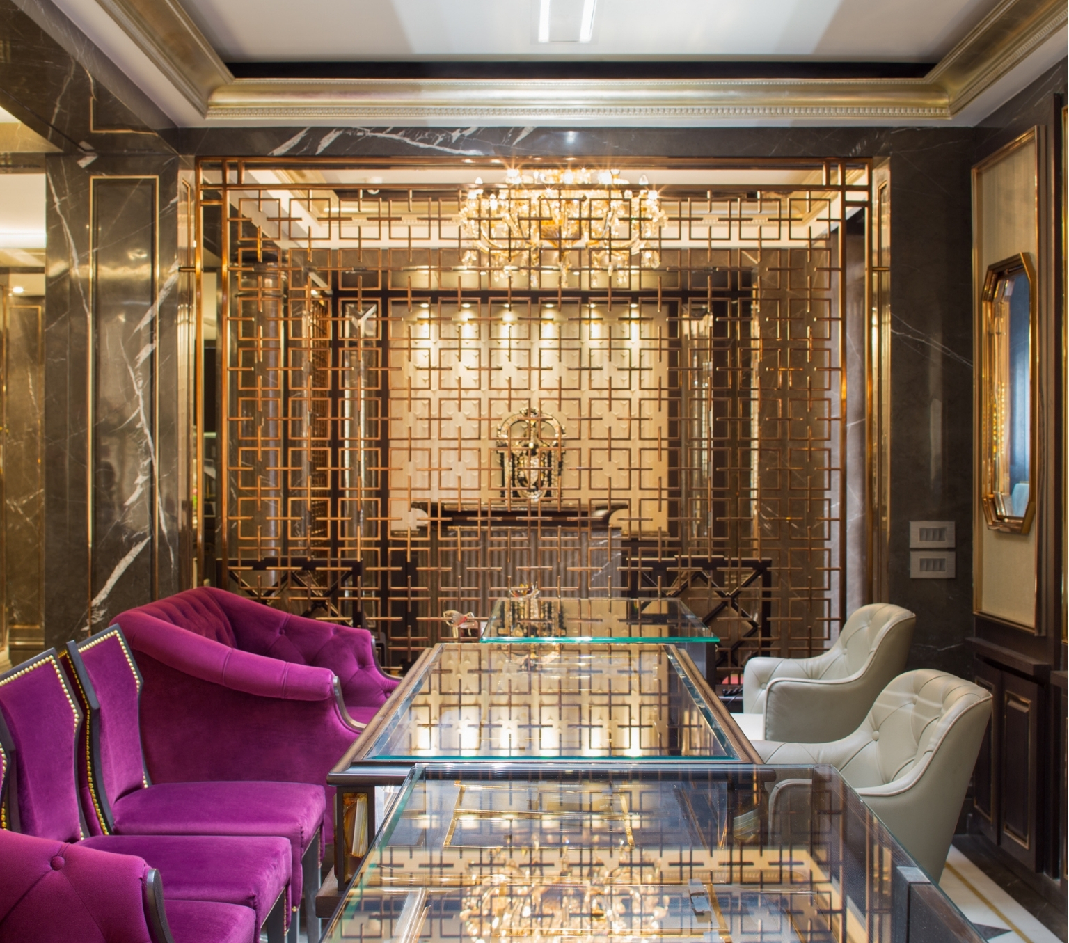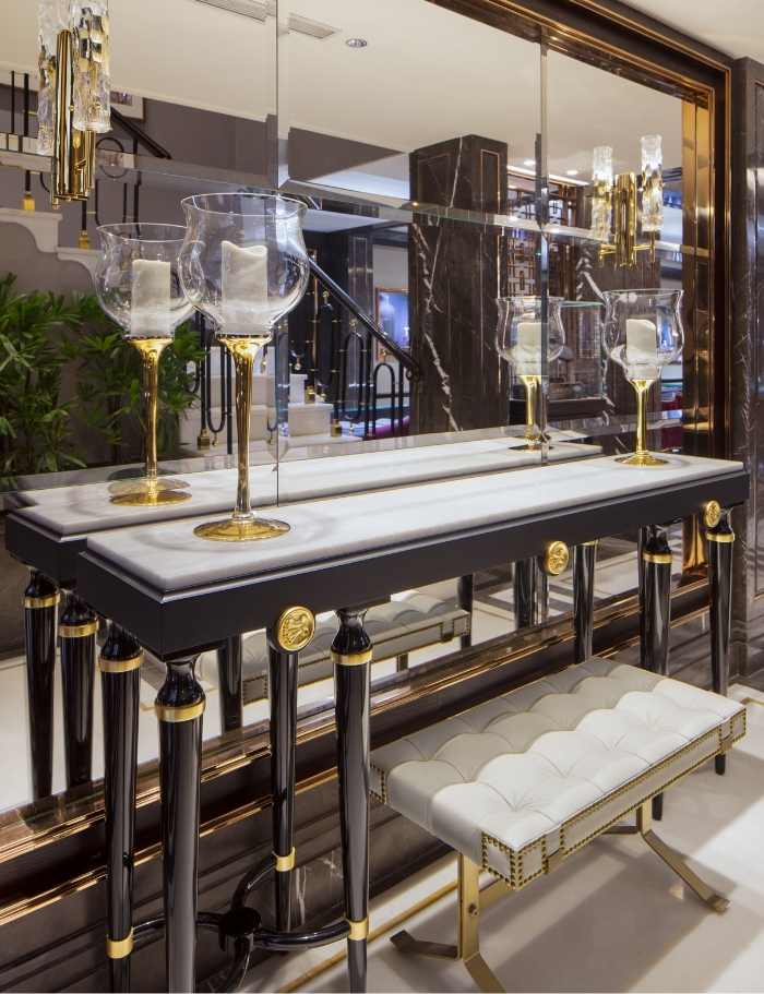 The need to make the space formal and royal fixed the focus on a design that was clinically symmetric. Whilst an asymmetrical design gives it a more playful feel, the aristocracy associated with high-end jewellery called for a formal, geometrically accurate layout.