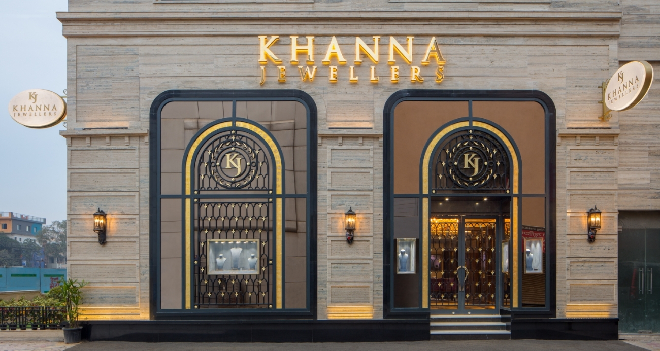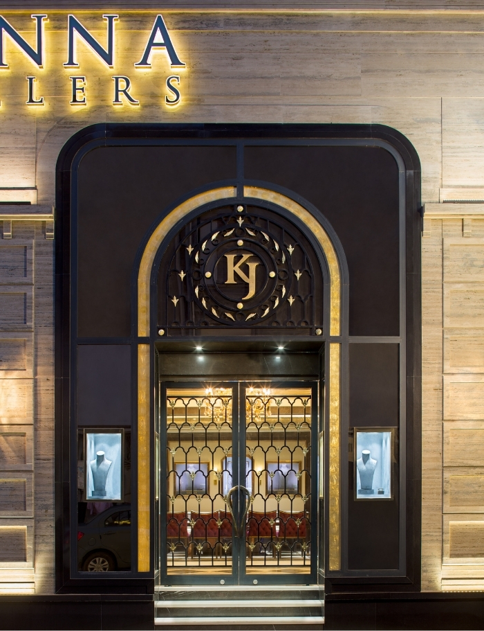 A showroom that justifies the legacy of Khanna Jewellers. Three doorway arches on the façade are connected by cornices. The black metal framework on the door adds a brilliant interplay of colours. The hand knobs are gold-plated, which pairs with the black of the door. Neoclassical elements, such as lanterns, add finishing touches to the classic details. A small portion of the front land has been optimally landscaped to complete the design experience.