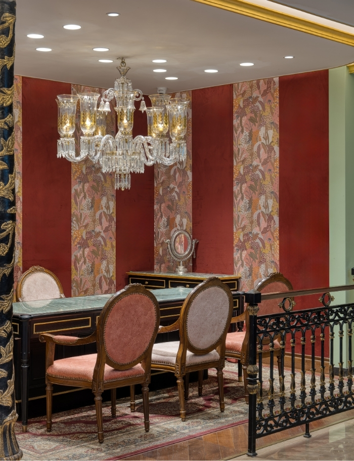 Artworks and framed portraits punctuate the walls, grounding the store in a sense of heritage and cultural richness, while the finely detailed furniture complements the craftsmanship on display. Together, these elements create a setting that is both luxurious and welcoming—transforming the showroom into a space where jewellery is not just viewed, but celebrated.