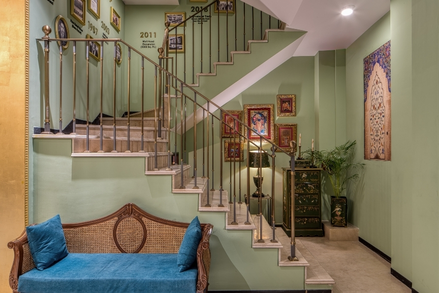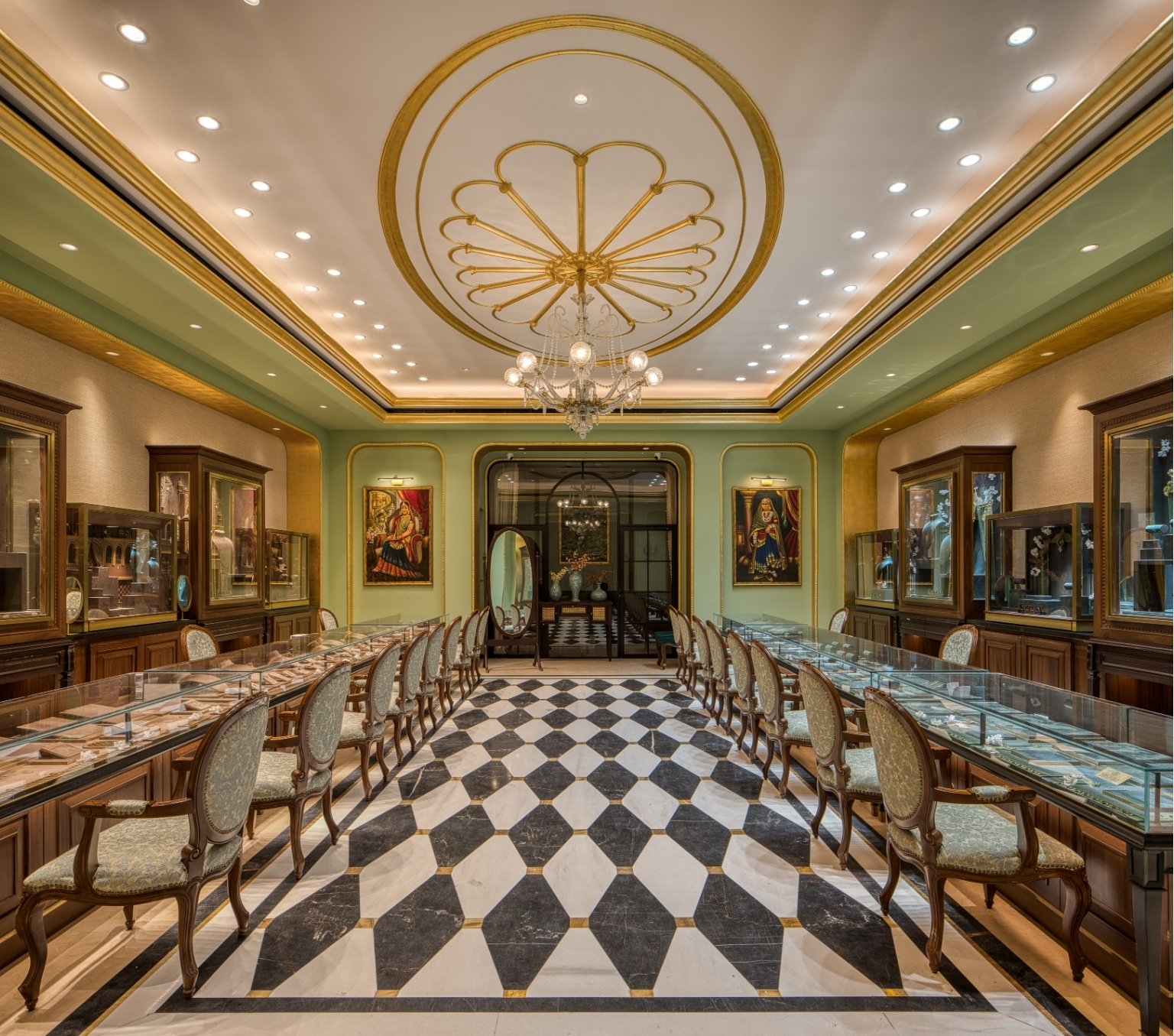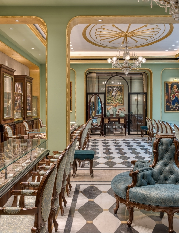 Artworks and framed portraits punctuate the walls, grounding the store in a sense of heritage and cultural richness, while the finely detailed furniture complements the craftsmanship on display. Together, these elements create a setting that is both luxurious and welcoming—transforming the showroom into a space where jewellery is not just viewed, but celebrated.