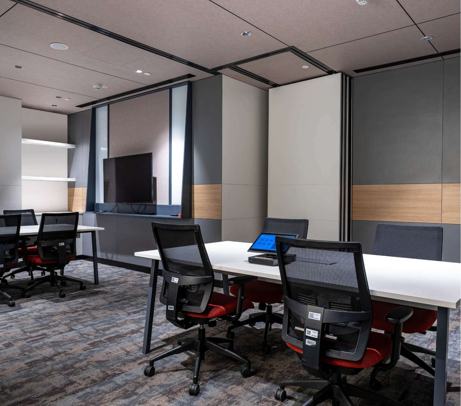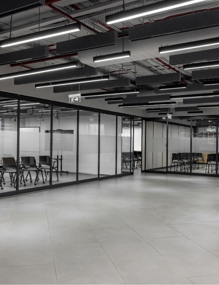 The training rooms are furnished with lightweight, foldable tables and chairs on casters, enabling effortless reconfiguration. This flexible furniture system allows for rapid layout changes to suit varying group sizes, training formats, and collaborative activities. While the academy offers comprehensive audio-visual support, acoustic materials are integrated throughout the space to ensure effective sound management and an enhanced learning experience.