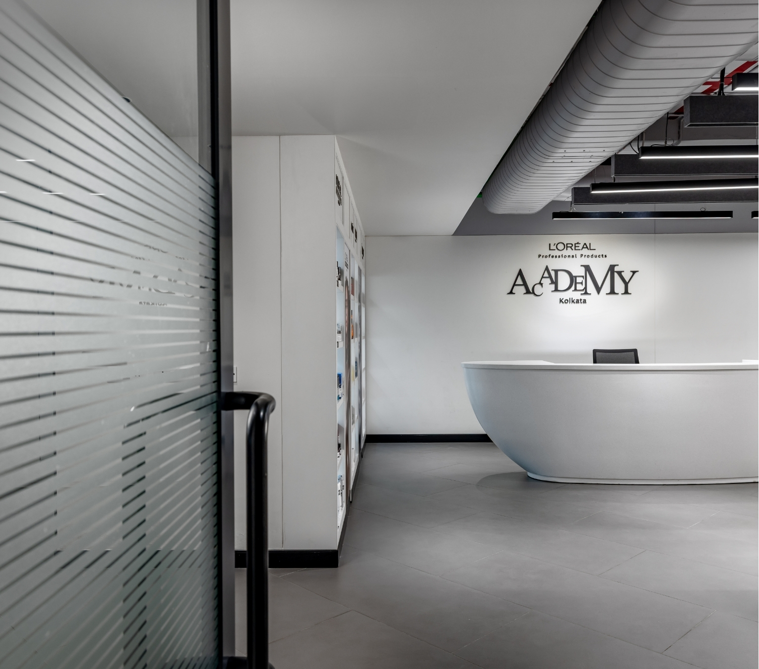 Each Technical Centre is conceived as a multifunctional space, supporting hairstyling sessions, workshops, and large-scale events. The Learning Labs consist of individual training rooms, each dedicated to a different hair product brand. Sliding and folding partitions allow these rooms to merge into a single expansive hall that extends into the reception and cafeteria areas, accommodating larger gatherings and events. Balancing spatial efficiency and openness, the academy transforms into a dynamic professional learning environment that can easily adapt to larger presentations, ramp walks, and creative events.