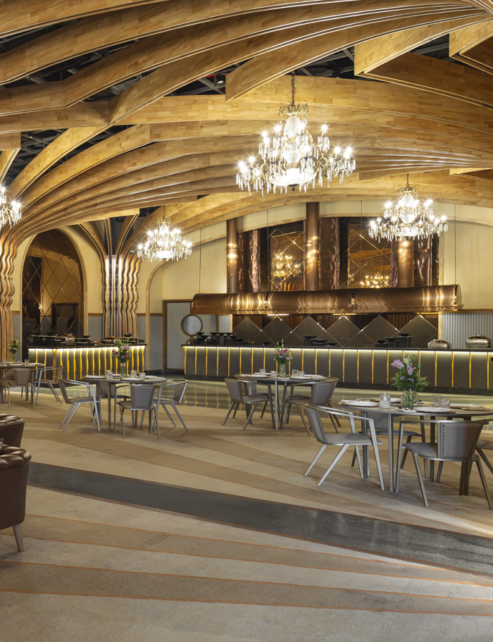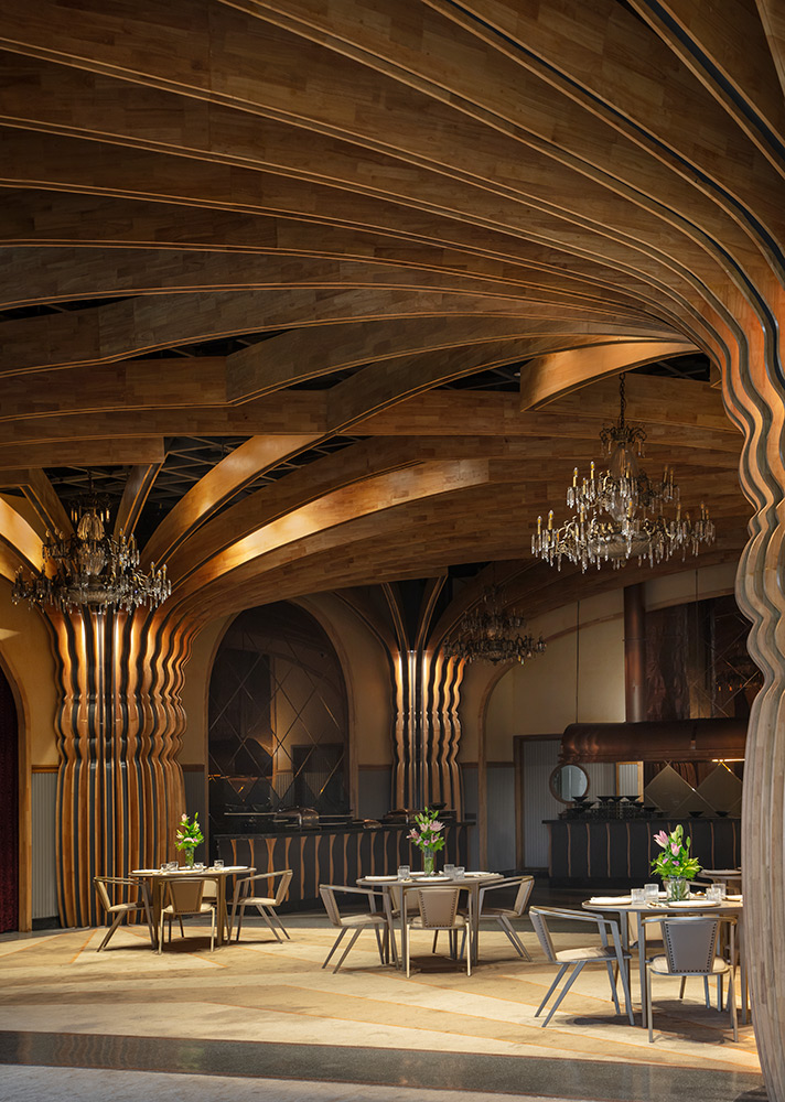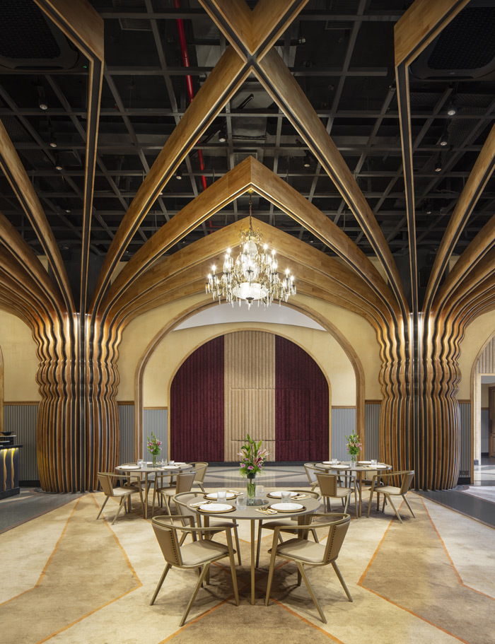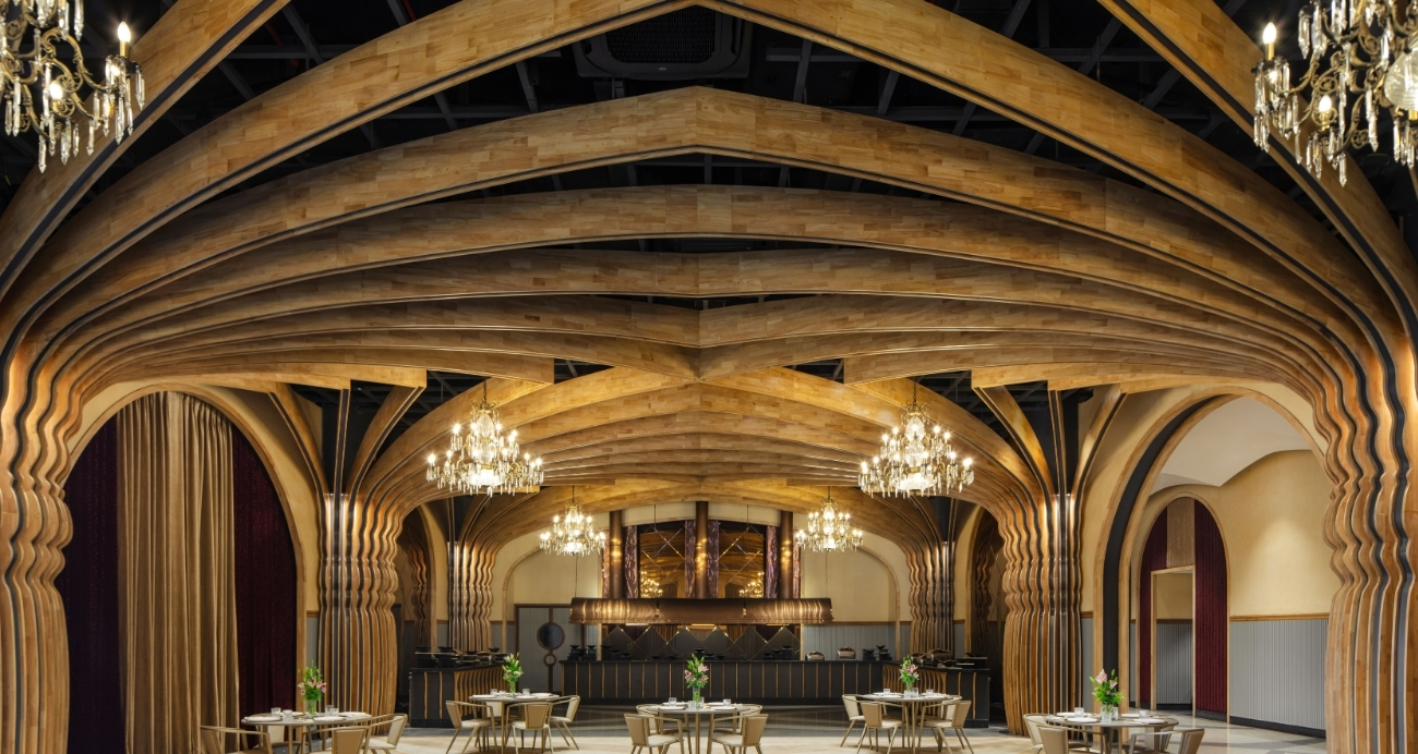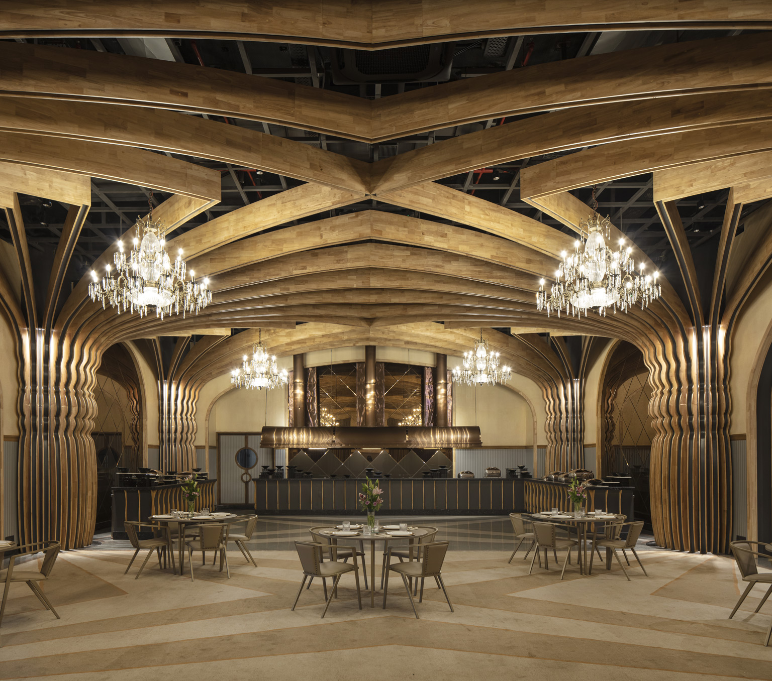 The interiors feature a warm, earthy colour palette that balances the space’s grand scale with a cosy, welcoming feel. Traditional craftsmanship meets modern technology, with CNC-machined precision and hand-finished details. Rubberwood boards shape the cross-vaulted ceilings and detailed columns, creating visual continuity and an understated yet grand character.