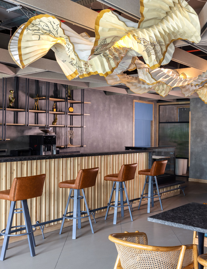 Paras Healthcare’s office space combines practicality with inspiration, reflecting the company’s unwavering pursuit of excellence. Beyond mere functionality, it features captivating chandeliers symbolising life and wellness that thoughtfully integrate natural elements. Every detail creates an environment that embodies the company values.