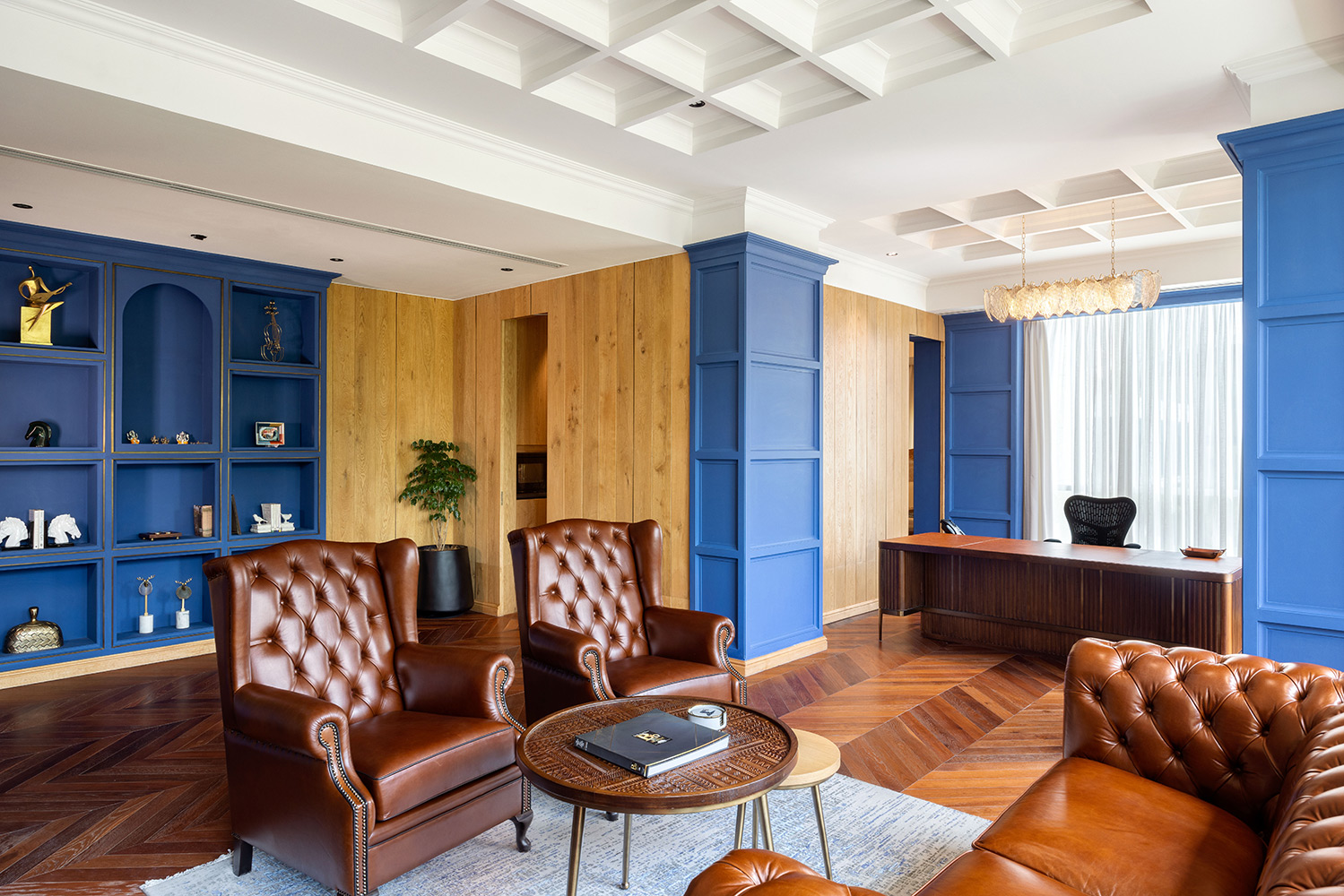 introduce elegance and organic texture. The interior exudes sophistication and tranquillity with soothing blue tones and vibrant accents from colourful screens that add a dynamic and playful touch. The design maximises the potential of raw materials and embraces minimalism, achieving a refined aesthetic that enhances the overall space.