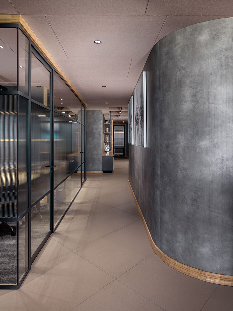 The design features micro-concrete walls with curved edges and fluted glass panels that guide circulation throughout the space. A neutral colour palette in the ceilings and flooring complements this aesthetic, creating a formal and chic atmosphere. This thoughtful combination makes a bold statement, enhancing the overall elegance of the office.
