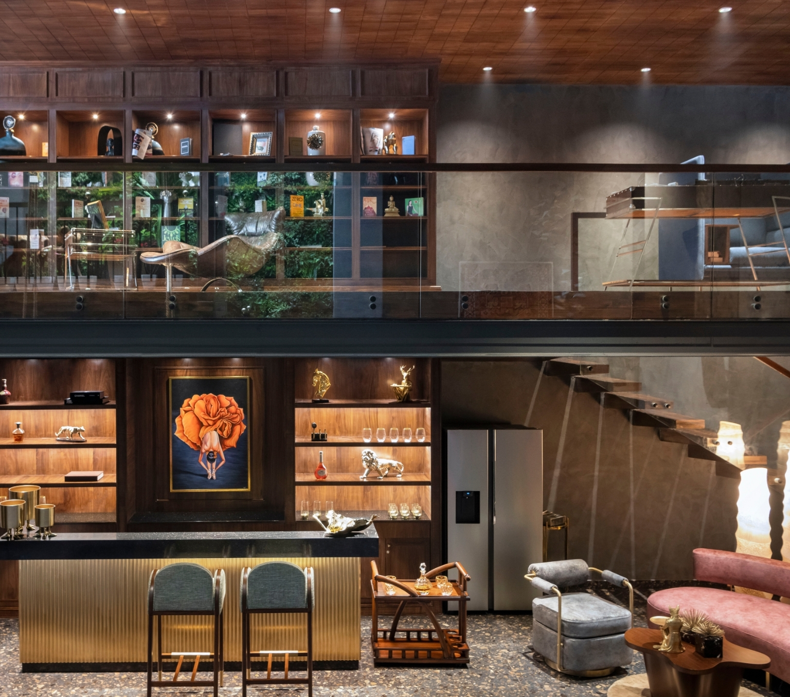 Rather than separate zones by floors, the design encourages visual and spatial interplay. The mezzanine space opens into the living space, which in turn connects to areas of rest, wellness, and recreation. This architectural rhythm blurs the boundaries between public and private, static and dynamic, indoors