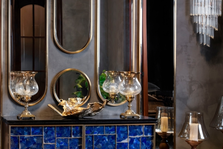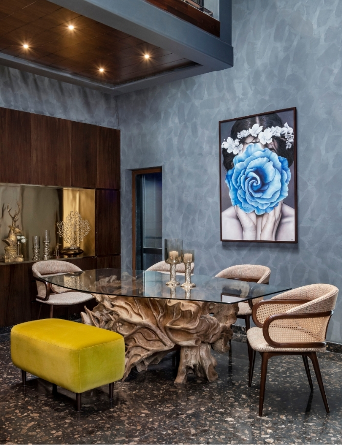 The material and lighting palette unifies the home’s aesthetic while adapting to different moods. Deep wooden finishes pair with grey tones and soft textiles, creating a canvas that is at once grounded and youthful. Sunlight animates the spaces during the day, while warm lighting and artisanal chandeliers bring a sense of serenity and glow after dusk.