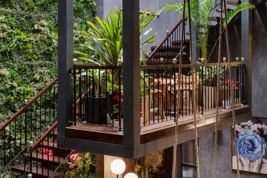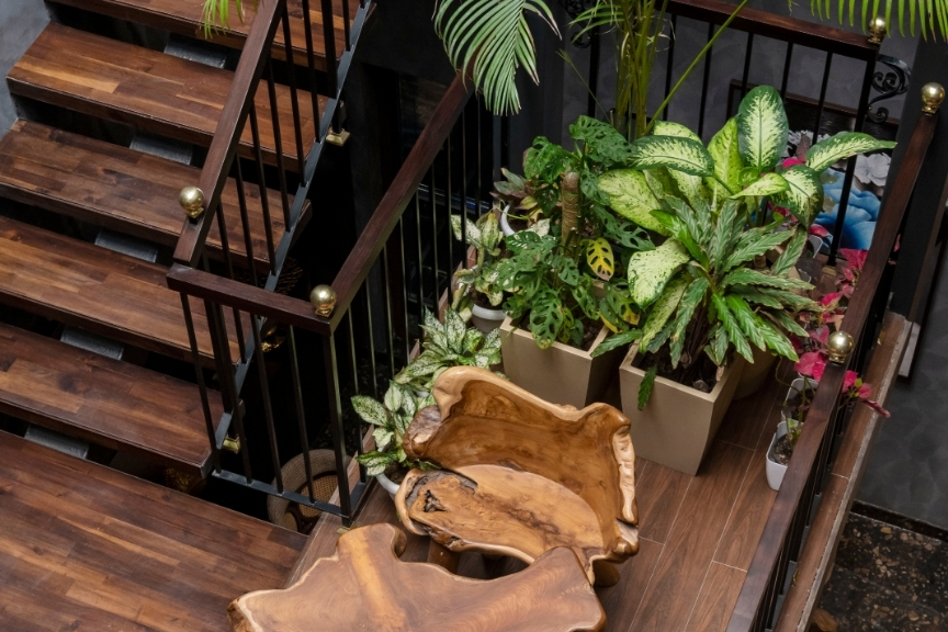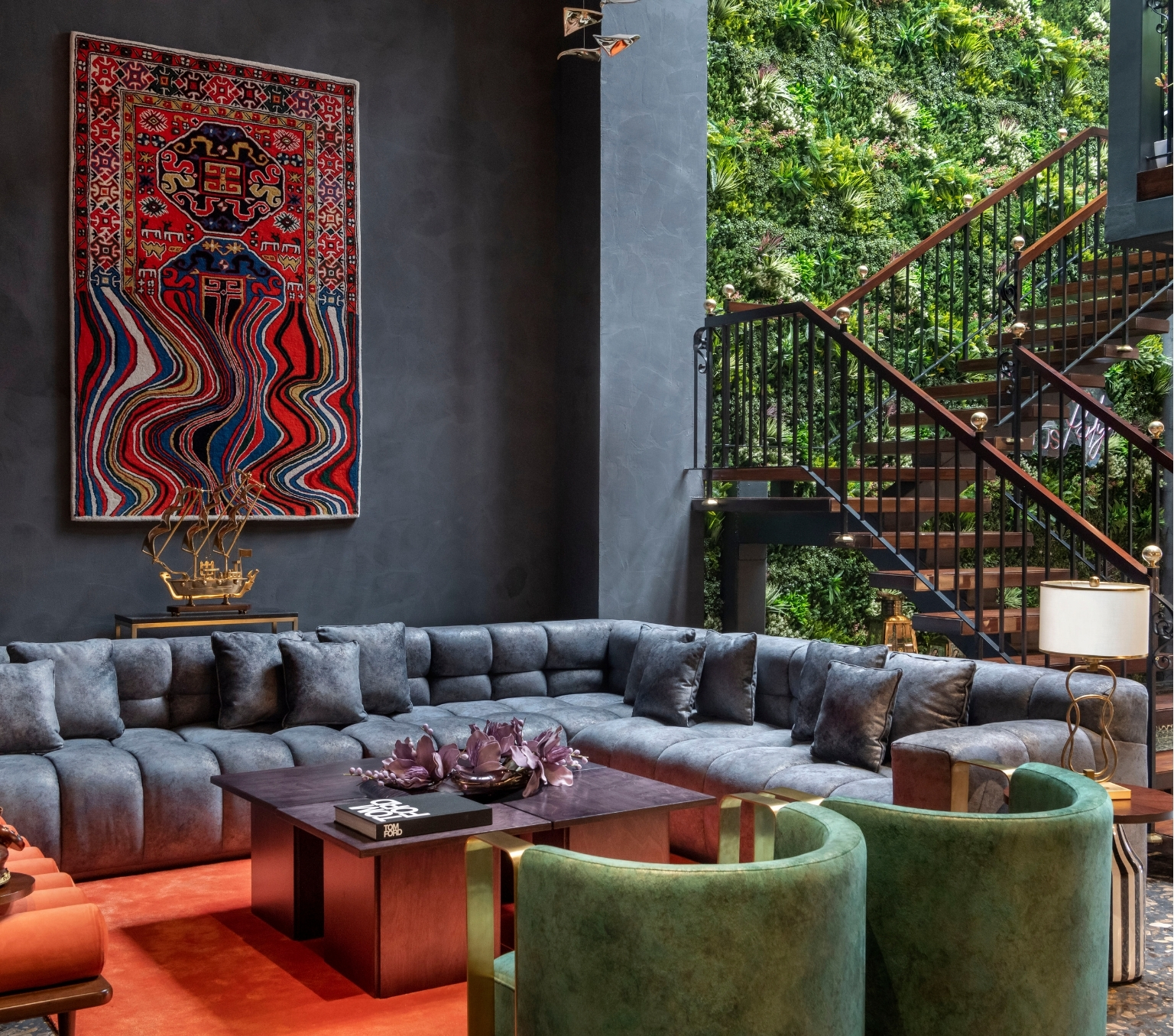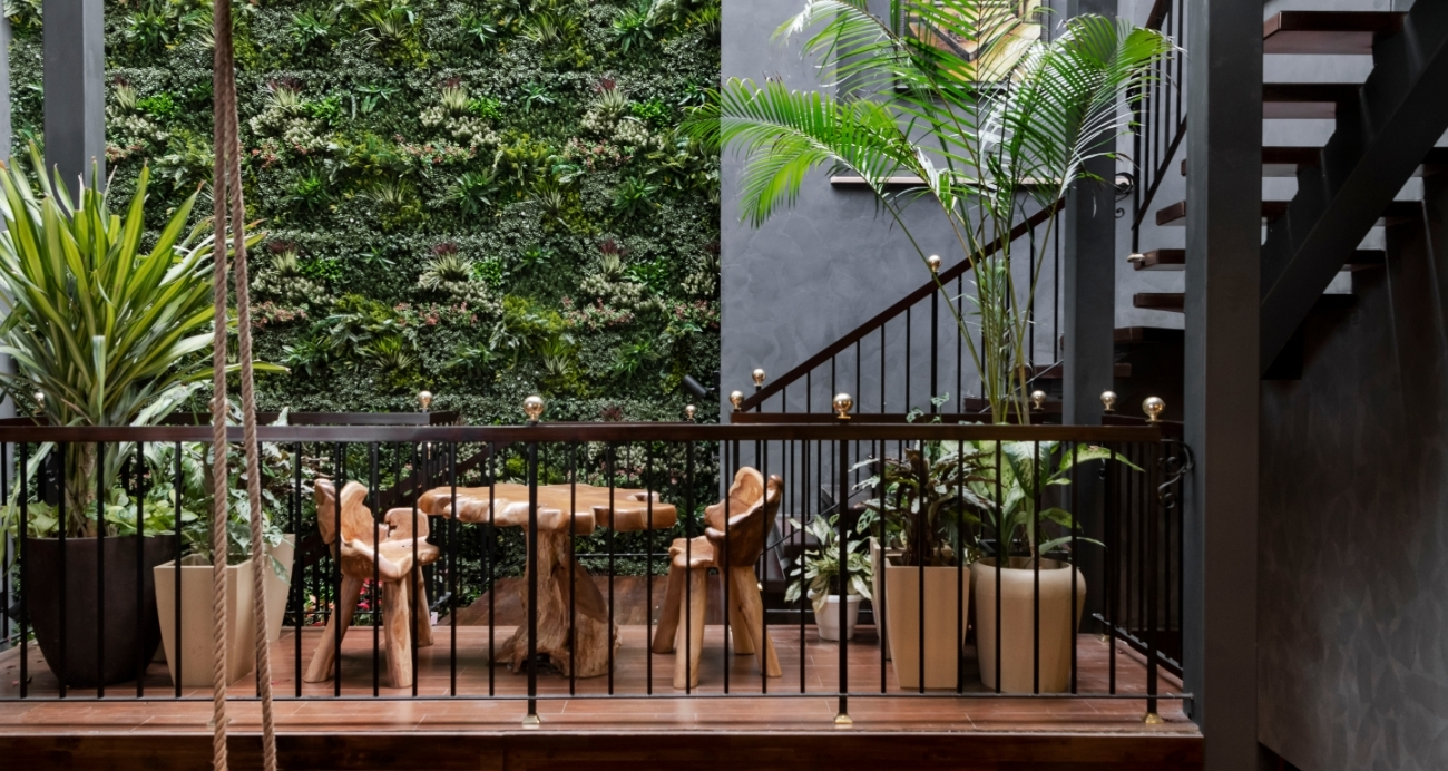 At the heart of the home lies a dramatic vertical hanging garden, acting as both a design statement and a functional spine. It visually connects the gym, spa, party hall, and living spaces, while also refreshing the atmosphere. The presence of plants brings balance to the geometric interiors, softening the composition.