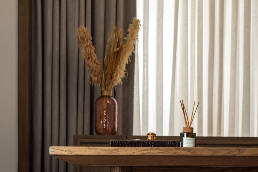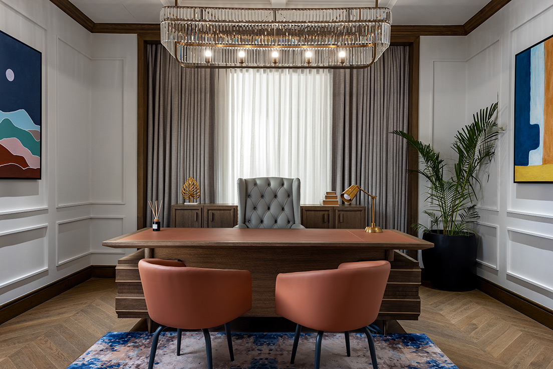 The directors’ cabins are crafted with a rich material palette of dark-stained oakwood and fluted glass, offering privacy and richness to the space. Bespoke furniture in deep, luxurious hues is set against the neutral-toned walls, creating a perfect and formal backdrop. Artworks and furnishings add character, infusing the space with warmth and individuality.