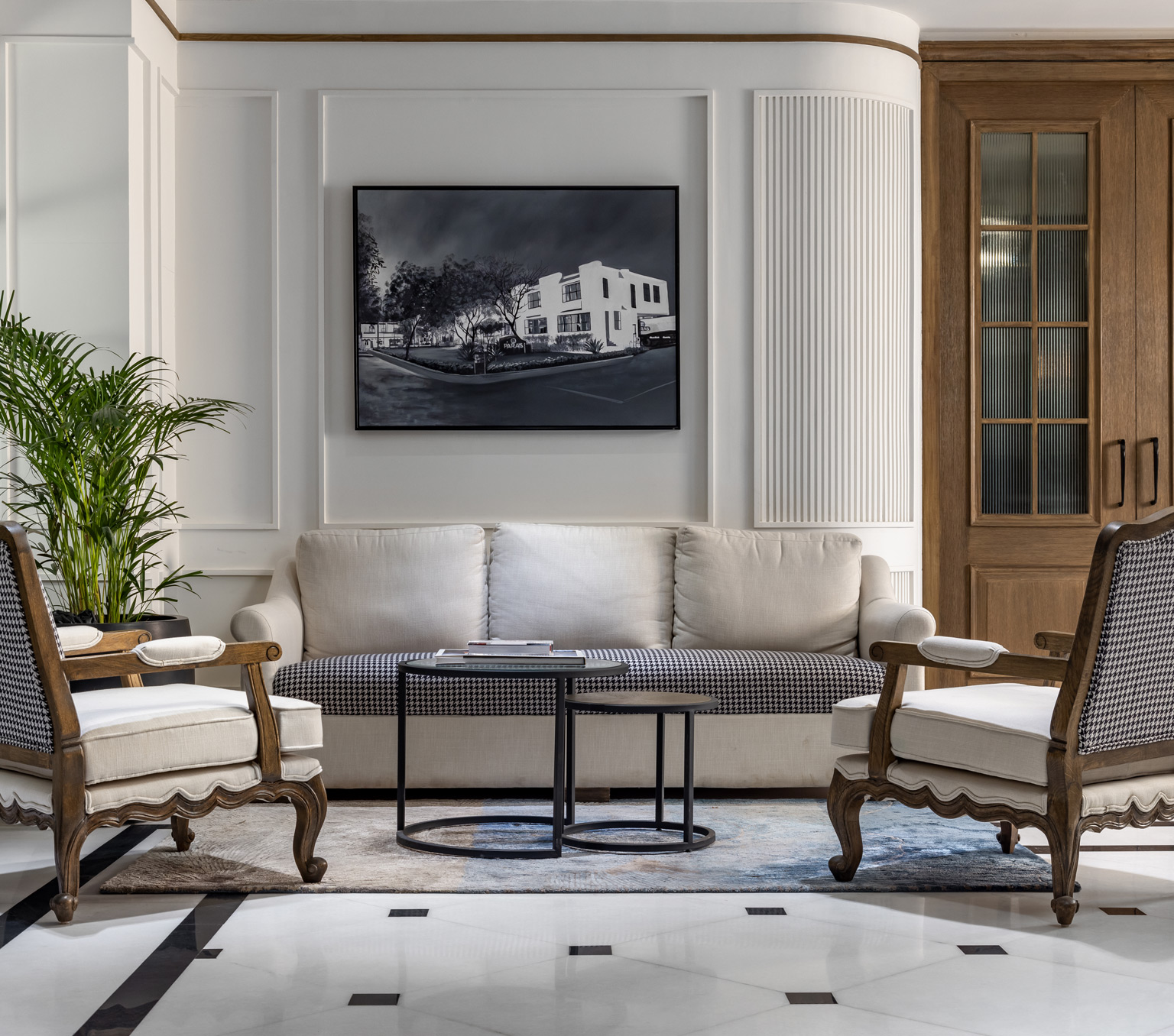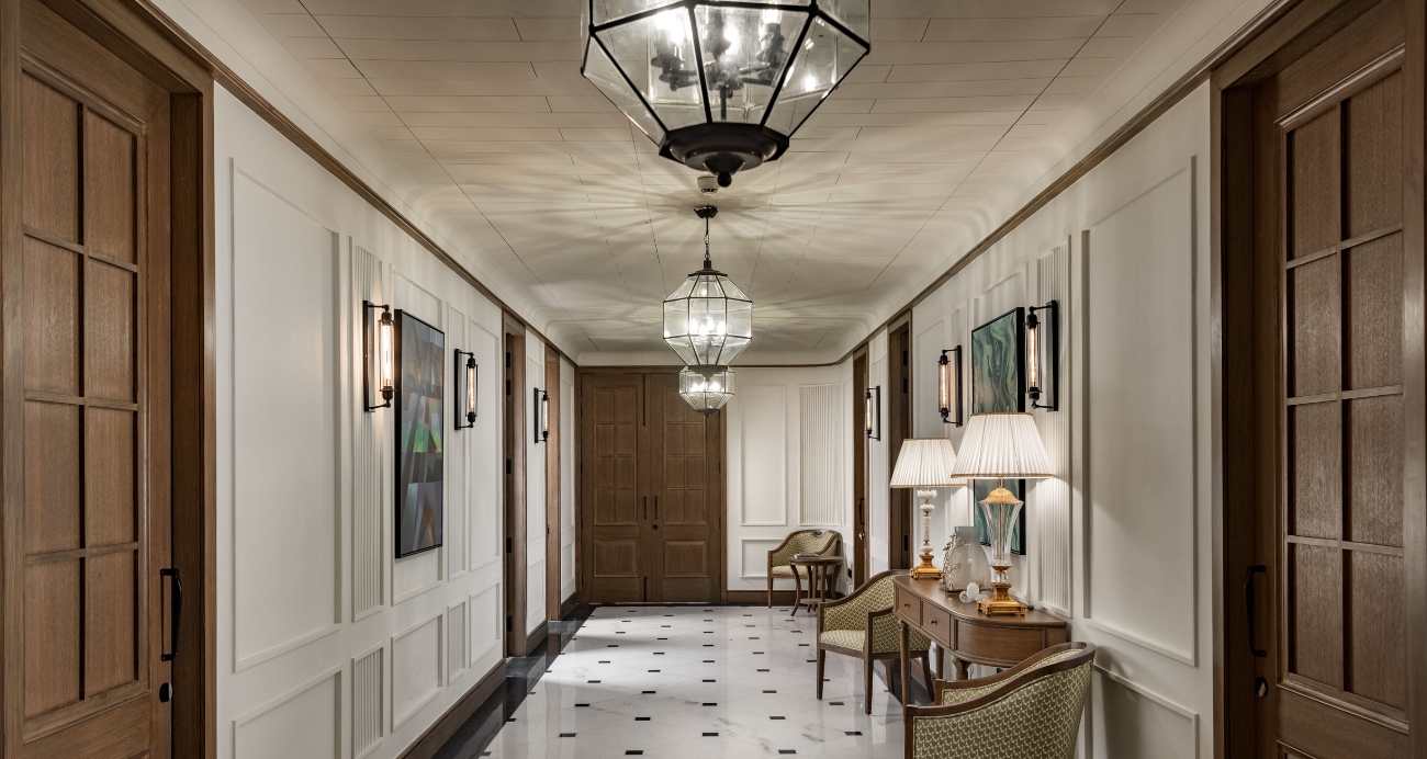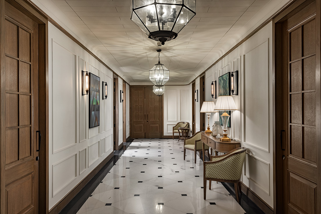 The lobby, bridging the public and private spaces, exudes a rich and layered aesthetic. Neutral tones compose the primary canvas, while mouldings that flow gracefully from walls to the door panels impart formality. Softly glowing lamps, thoughtfully placed paintings, and the intricate marble inlay flooring weave together a narrative of elegance and visually guide the user.