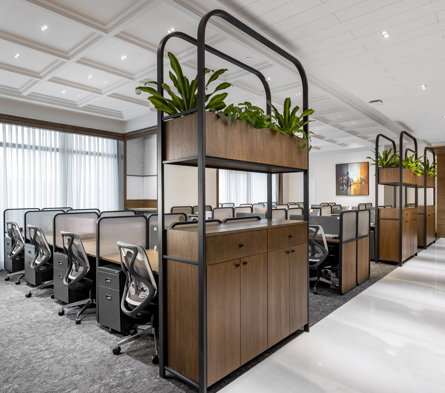 The workstations are bathed in soft, natural light streaming through an expansive north-facing window. The circulation is punctuated by bespoke partitions crafted by groupDCA, thoughtfully designed with integrated storage below and plant holders above. These partitions introduce a touch of biophilia to ensure functioning and connection to nature. VRS office is a standout example of how thoughtful, user-centric design reflects the company’s identity and sets a benchmark for modern office spaces in the evolving design conversation.